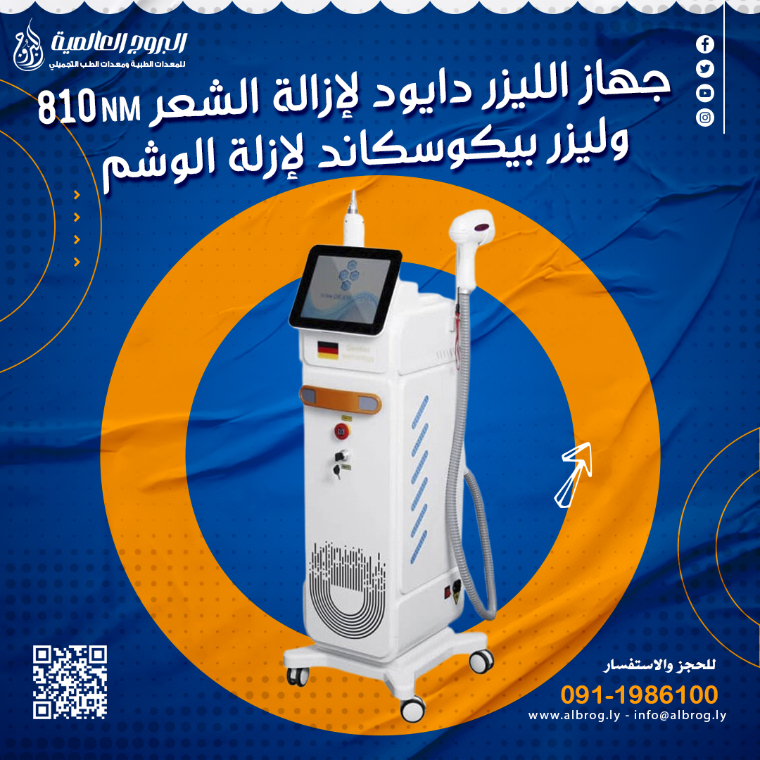 تواصل معناجهاز ليزر الدايود ذو التقنية الألمانية يعمل بنوعبن ليزر الأول ليزر دايود لإزالة الشعر وتجديد الجلد وليزر البيكوسكاند يعمل على